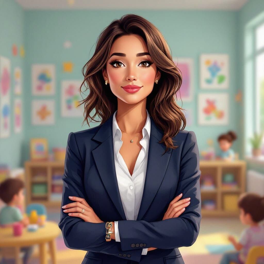 This image shows a businesswoman in a vibrant children's center. She is surrounded by toys and artwork, rendered in a digital painting style with bright, saturated colors.