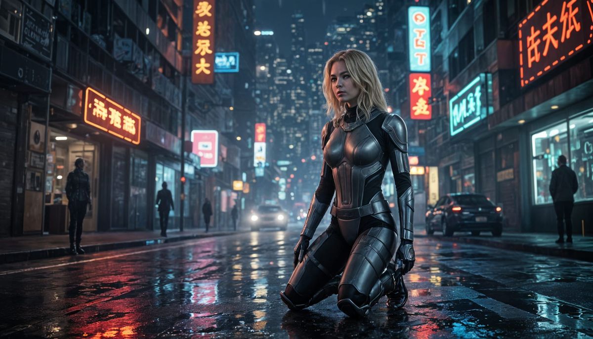 This image shows a young woman in a detailed metallic suit kneeling on a wet, neon-lit city street at night. Reflections from vibrant signs create a dramatic cyberpunk atmosphere.