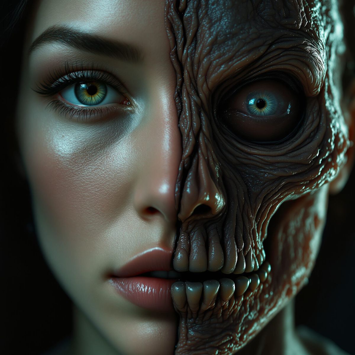 A hyper-realistic portrait of a woman whose natural beauty is corrupted by a grotesque, unnatural facial deformity. One side of her face remains stunning — flawless skin, shimmering eye, elegant cheekbones — while the other side is warped in body-horror fashion: flesh appears melted and sagging, bone ...
