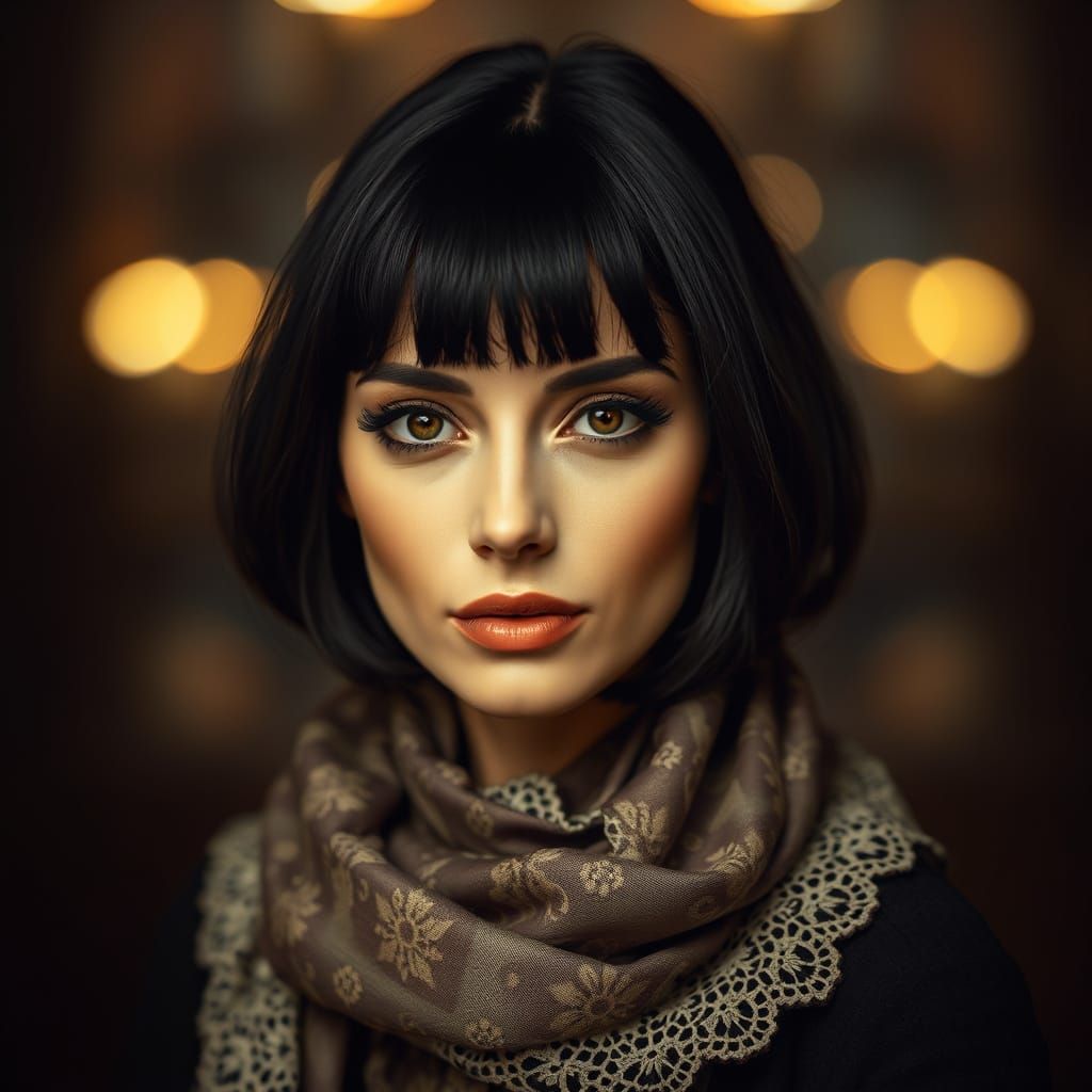 This image is a stunning portrait of a woman with dark hair and brown eyes, adorned with a beautifully patterned scarf, set against a softly blurred background with a moody, cinematic atmosphere, reminiscent of classic fashion photography with a vintage, ethereal feel.
