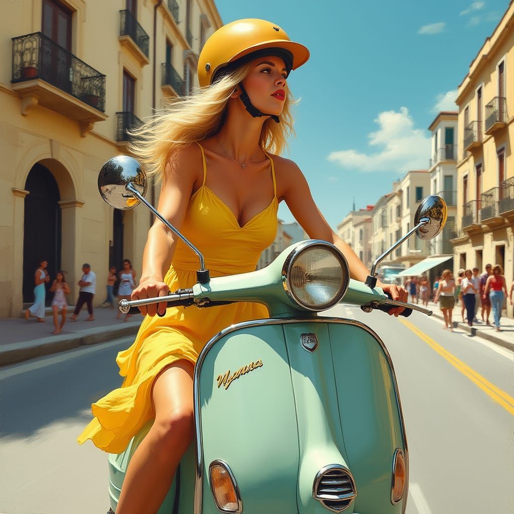 A vibrant image of a blonde woman on a vintage Vespa in Naples, Italy. The artwork captures an Italian neorealism aesthetic with bold brushstrokes and bright, summery colors.