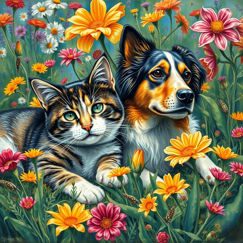 This image shows a charming pet garden scene with a cat and dog lying in the grass, surrounded by vibrant flowers, rendered in a detailed impressionist style with thick brush strokes and textured gouache watercolors, reminiscent of the works of Alphonse Mucha and Egon Schiele.