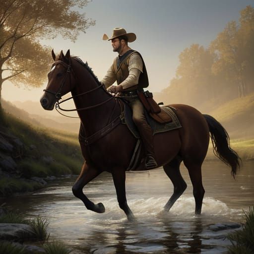 A cinematic film still of a handsome young shepherd boy gently stroking his horse near a tranquil stream, bathed in warm golden light and earthy tones, with a sense of naturalistic beauty and inspiring atmosphere.
