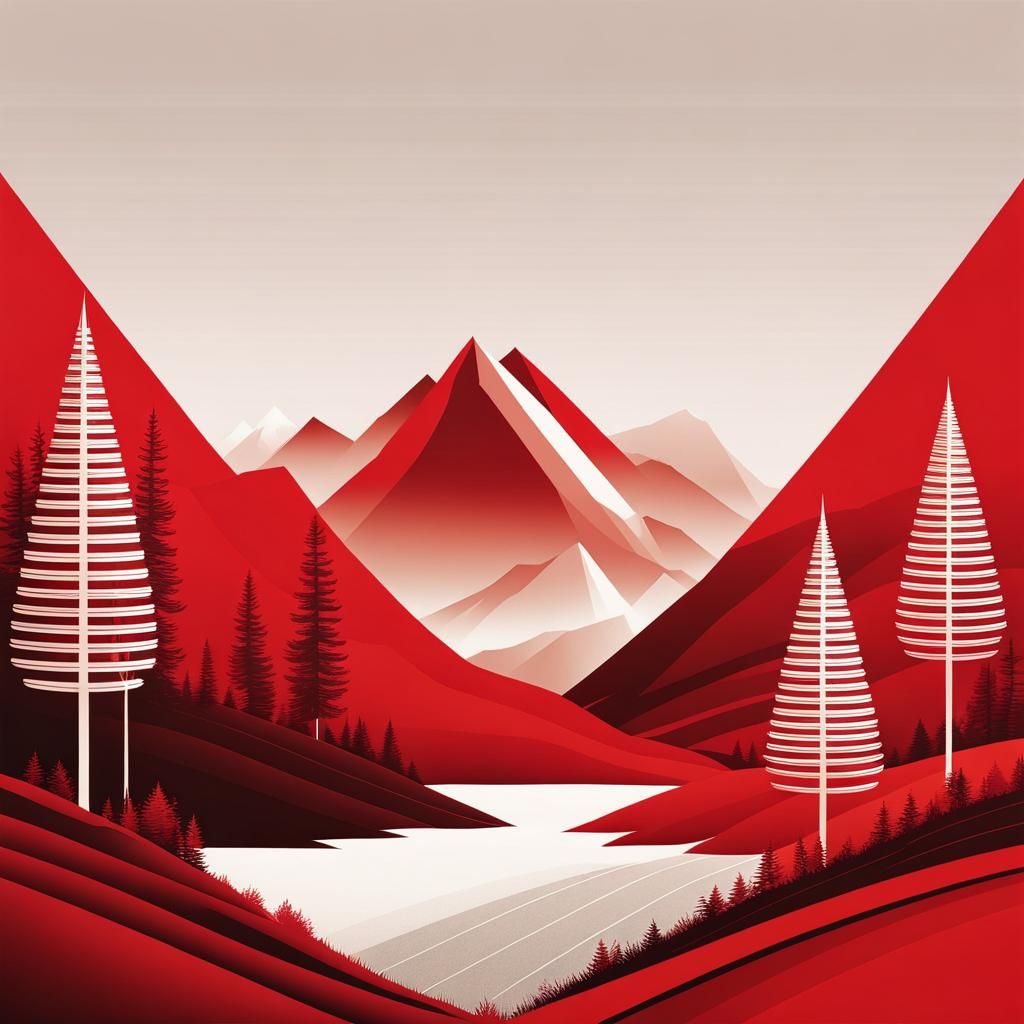 This image shows a minimalist vector art mountain forest landscape in red and white. The artwork is in a hypermodernist style, reminiscent of 18th-century dye-transfer atlas designs.