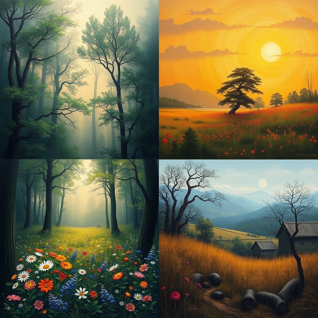 This image showcases the mystical world of Baltic mythology, where Žemyna's gentle touch brings life to four distinct landscapes, each capturing a seasonal rite. From misty forests to vibrant meadows, these dreamlike scenes evoke the works of Ivan Shishkin and the Fauvists.