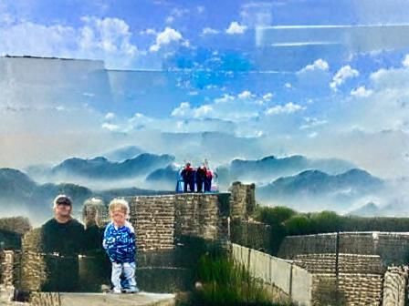 This image shows a family of four posing in front of the Great Wall of China. The family consists of a father, mother, son, and daughter, captured in a tourist snapshot.