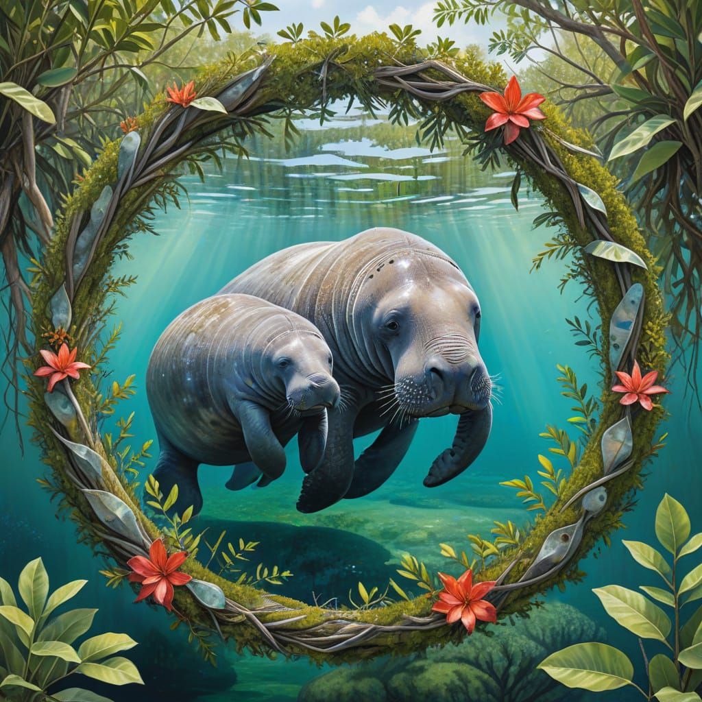 This image shows a serene and peaceful scene of a manatee mom and baby in a lush, vibrant mangrove lagoon in Florida, surrounded by tropical flora and framed in a circular wreath of tropical foliage.