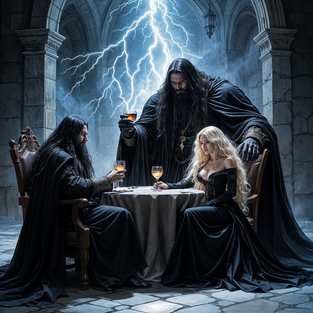 A digital painting depicts a dark wizard with long hair and beard seated next to a giant in a castle hall. The giant holds a blonde woman as lightning courses through his hair.