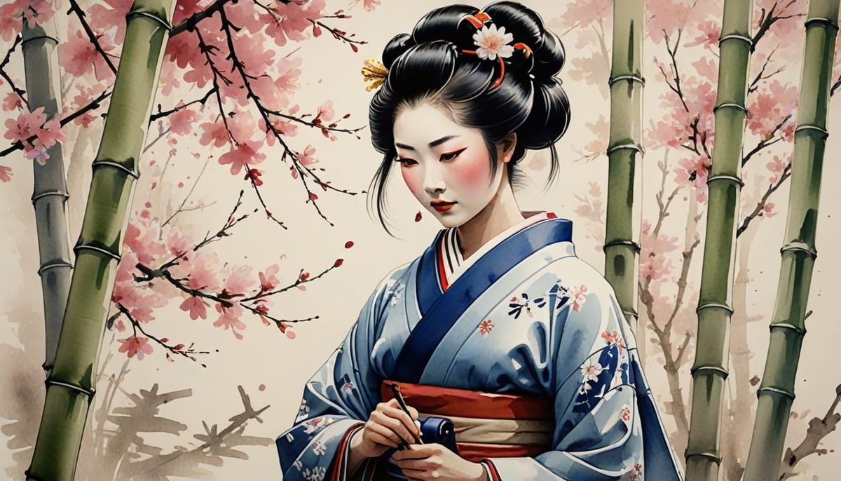 A sumi-e style image of a geisha practicing calligraphy in a bamboo garden. Cherry blossoms filter the sunlight, rendered with soft watercolor techniques and muted ink tones.
