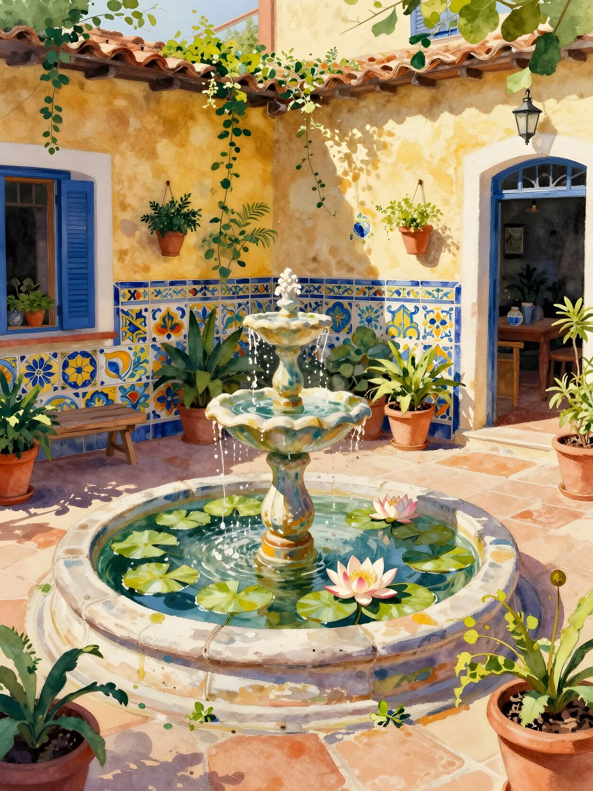 A tranquil Mediterranean patio with a fountain, colourful tiles, and abundant plants, captured in an expressive watercolor style with visible brushstrokes and bleeding colors.