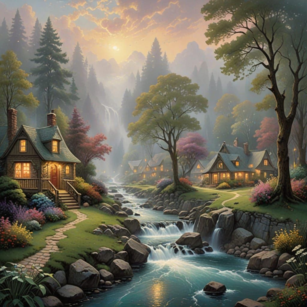 A serene image of people enjoying a stream in nature. The scene evokes a hyperdetailed fantasy landscape with a misty, ethereal atmosphere, reminiscent of Kinkade's style.