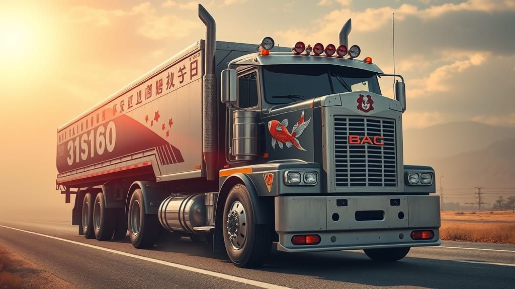 This image shows a Mac truck undergoing a wild transformation into a mecha-style robot with Japanese anime aesthetics. The design blends rugged truck elements with vibrant, sleek anime details.