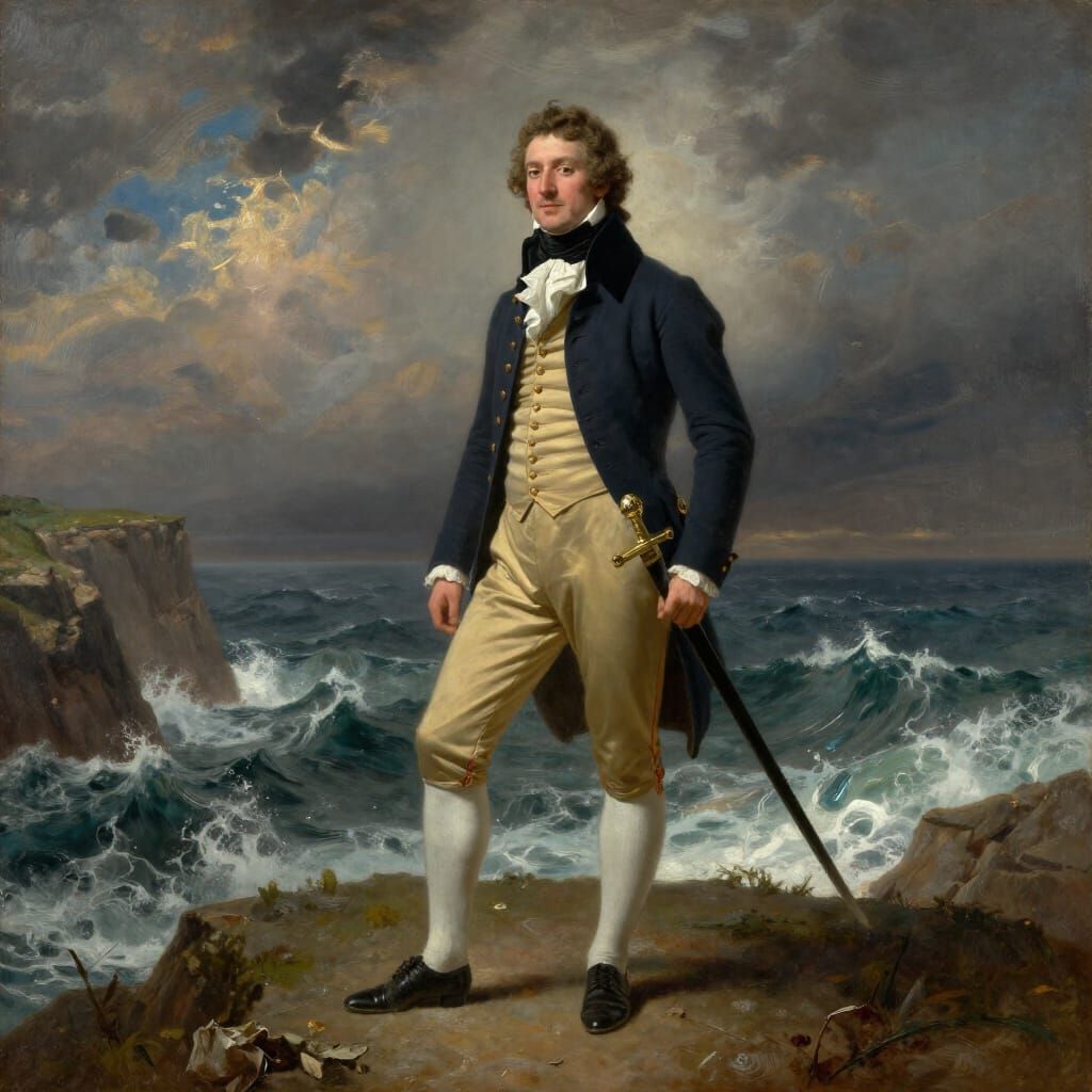 This image depicts a heroic gentleman in historical attire, sword drawn, on a dramatic cliff. Rendered in an oil painting style reminiscent of Romantic landscape artists.