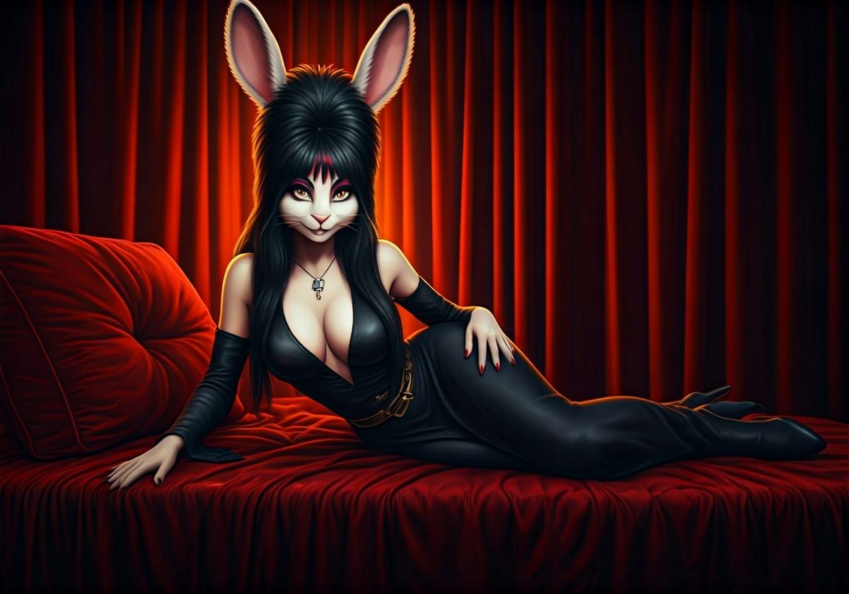 This image shows an anthropomorphic rabbit dressed as Elvira, Mistress of the Dark, reclining on a red velvet chaise lounge in a sensual pose. The image has a gothic horror aesthetic.