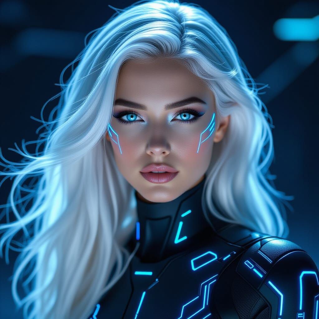 A striking picture of a futuristic woman with flowing silver hair and piercing blue eyes. Cybernetic patterns shimmer across her porcelain skin in a cyberpunk aesthetic with holographic accents.