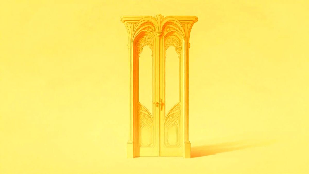 “A single ornate doorway floating in a soft golden-yellow void. The doorway is simplified and symmetrical, inspired by Art Nouveau arches an...
