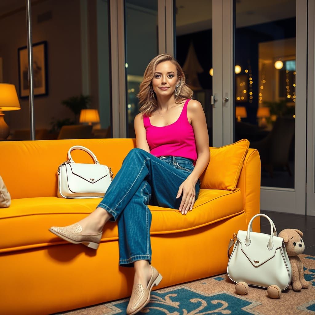 A vibrant image of a woman relaxing on a yellow sofa in a stylish lounge. The scene blends playful elegance with art nouveau elements in a whimsical digital art style.
