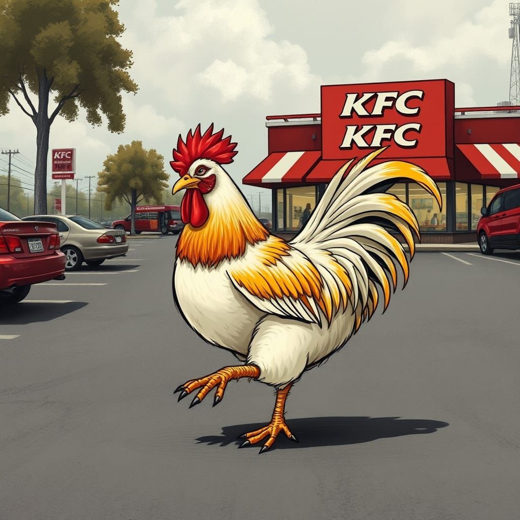 This image shows a confident chicken strutting across a KFC parking lot, its bright feathers standing out against the drab surroundings in a humorous, satirical illustration