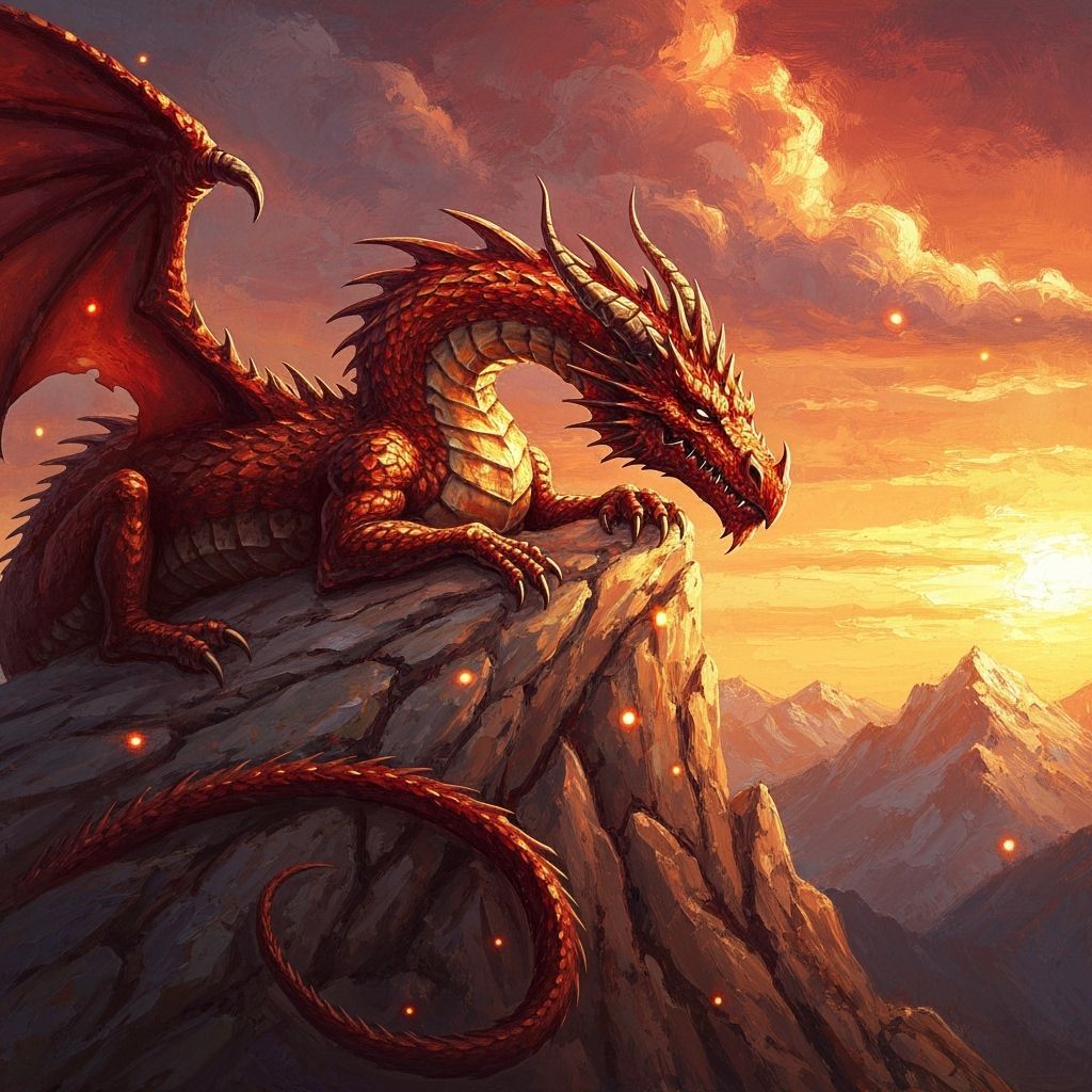An impasto oil painting featuring a red dragon on a mountain ridge during sunset. Thick brushstrokes create texture for scales and clouds, with glowing light accents and a tender expression.