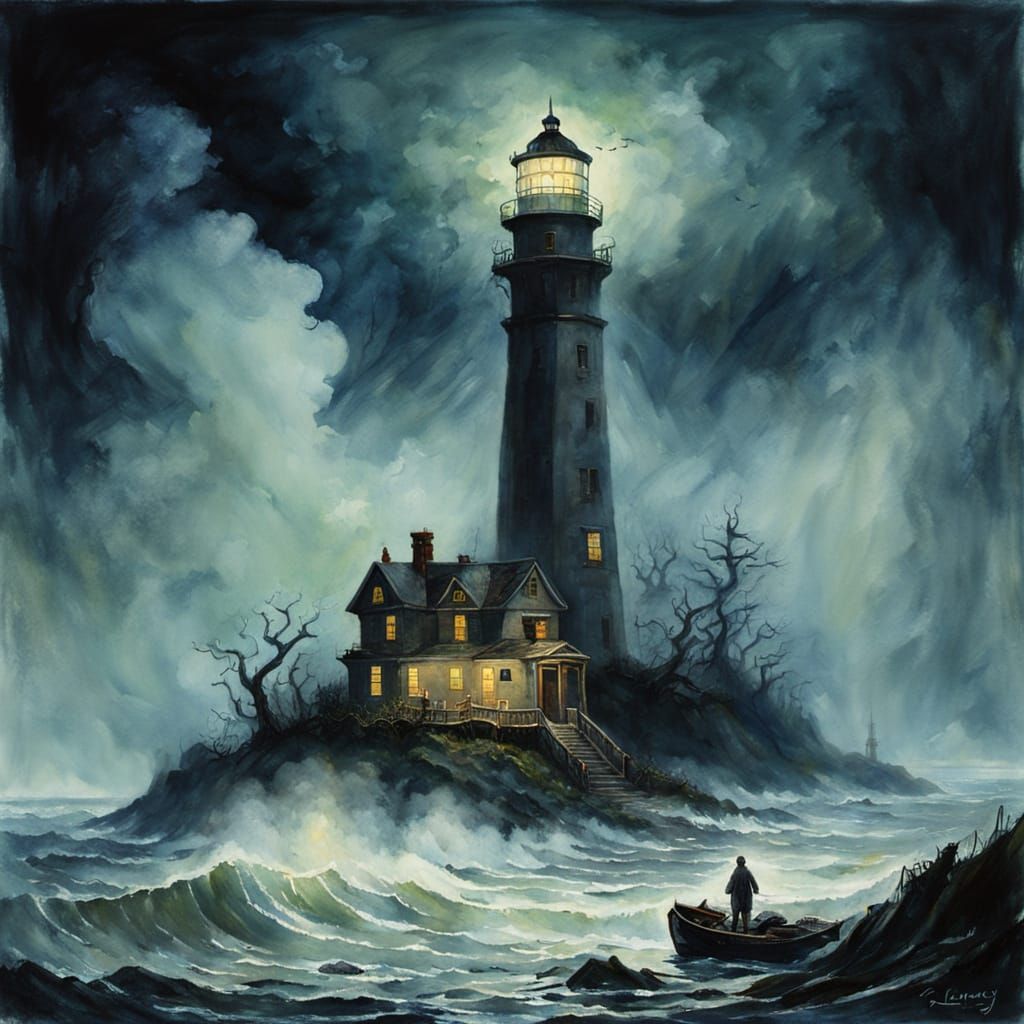 A haunting image of a lighthouse shrouded in dark fog, with Lovecraftian creatures lurking nearby. The scene is rendered with watercolor and oil painting techniques, creating a surreal atmosphere.