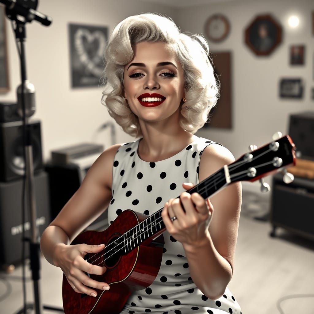 A striking black and white portrait photograph captures Marilyn Monroe, exuding an infectious charm with a sweetly timid smile as she gently strums a ukulele. She is dressed in a short, sleeveless white dress playfully adorned with black polka dots, her iconic platinum blonde hair styled in soft, voluminous ...