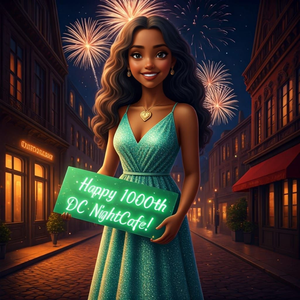 This image shows a beautiful black girl in a sparkling mint green dress celebrating NightCafe's 1000th Daily Challenge. The scene is a fancy night cafe with fireworks, rendered as highly detailed 3D digital art.