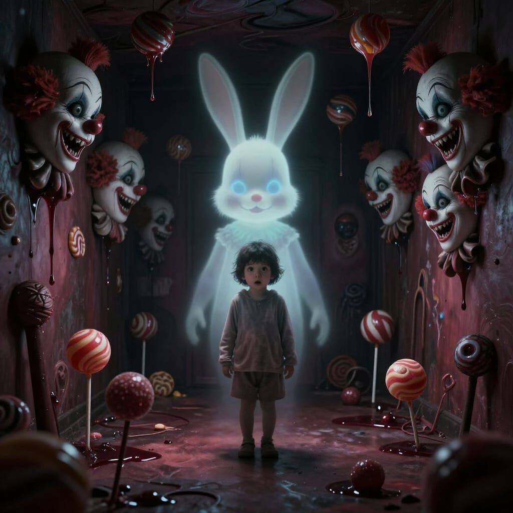 This image shows a spectral bunny guiding a fearful child through a nightmarish, candy-themed funhouse. The scene features distorted clown faces and dripping lollipops, rendered in a hyperdetailed, cinematic style with dramatic lighting.
