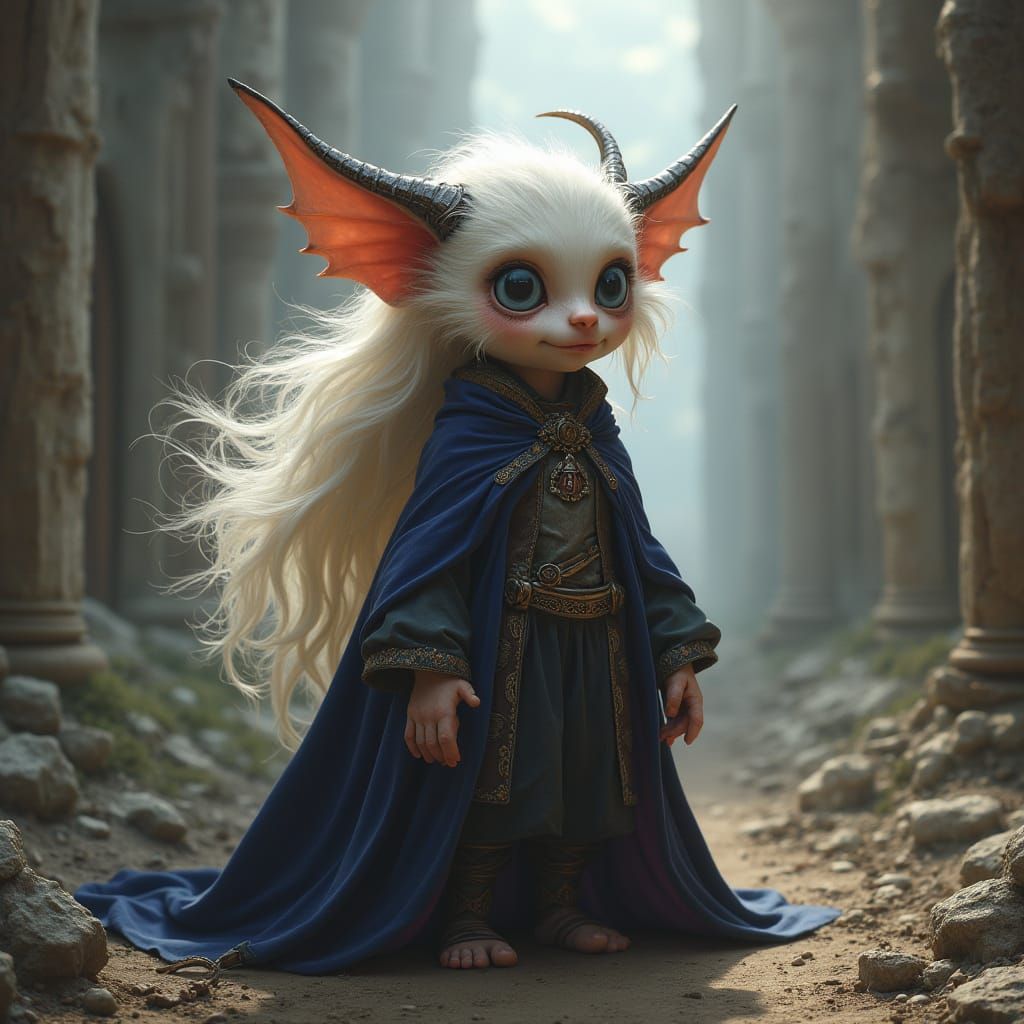 A digital painting of a cute demon with long white hair in velvet clothing, set in ancient ruins. The image is rich with dramatic atmosphere, intricate details, and textures.