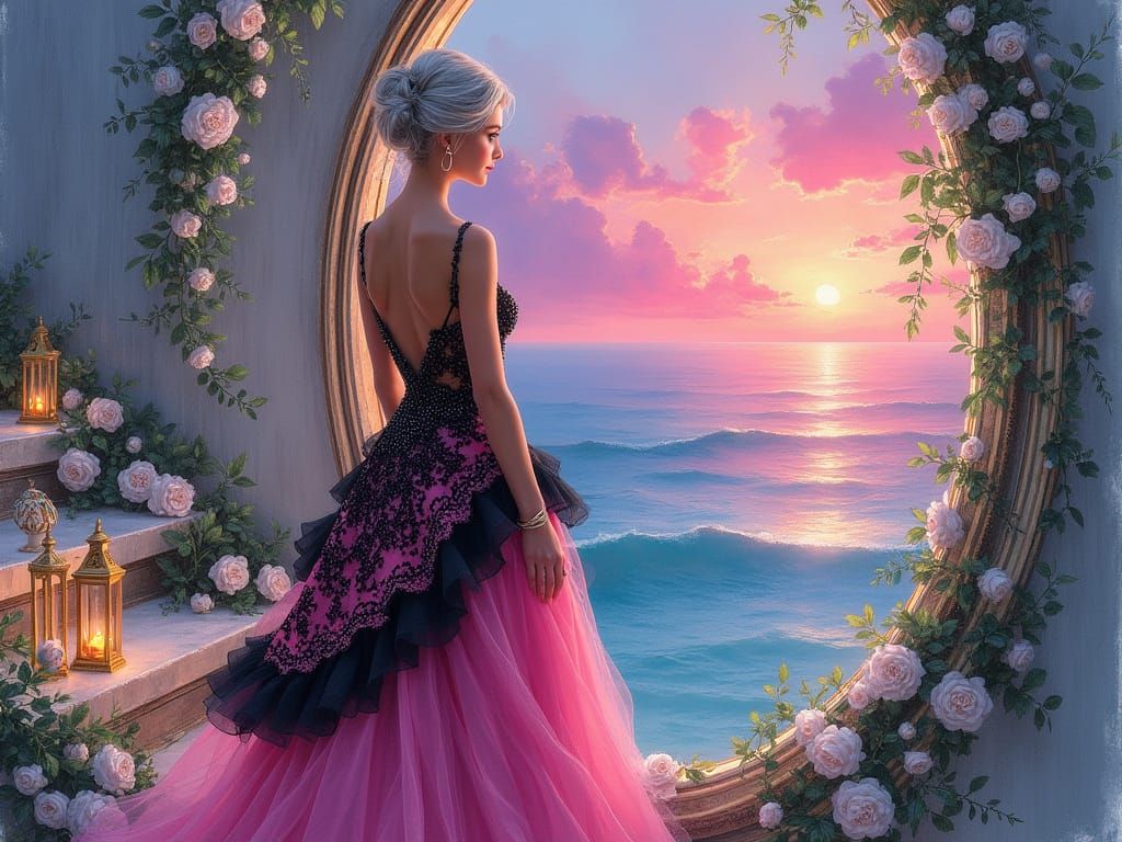 This image shows a woman with silver hair in an updo, wearing a pink and black ruffled gown. She stands on a glass staircase with roses, before a vibrant sunset over the ocean. Rendered in a detailed watercolor style with visible brushstrokes and bleeding colors.