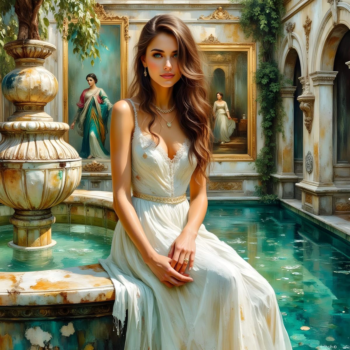 A striking picture of a beautiful woman with heterochromia, smiling in a courtyard. The scene features classical architecture and an ornate fountain, rendered in a textured impasto style.