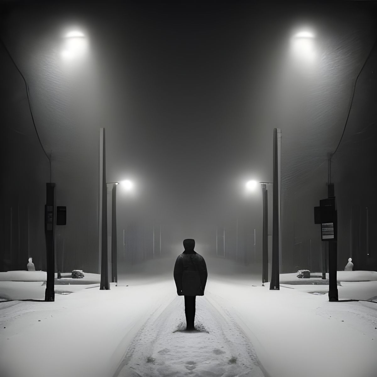 This image shows a snowy winter night scene. Street lights illuminate a snow-covered pavement lined with trees. The close-up portrait is bathed in ambient light, reminiscent of Lee Jeffries' and Alessio Albi's photographic styles.