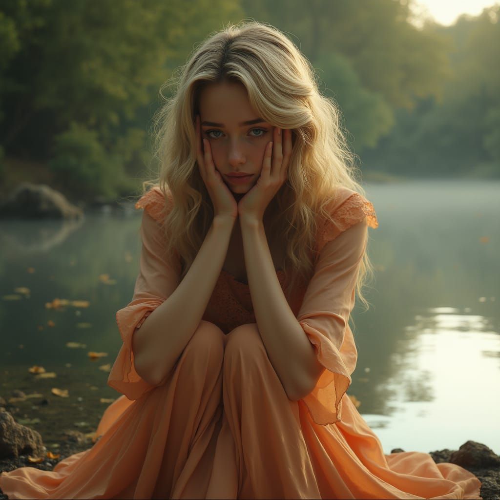 This image shows a woman in a light orange silk dress kneeling by a lake, expressing deep sorrow with tears. Rendered in a hyperrealistic, cinematic style with soft, melancholic lighting.