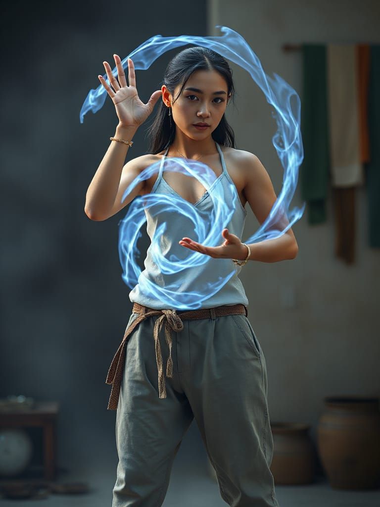 This image shows a confident Vietnamese woman magician with an athletic build, swirling blue magic around her hands. This digital painting features realistic textures and atmospheric lighting in a minimalist style.