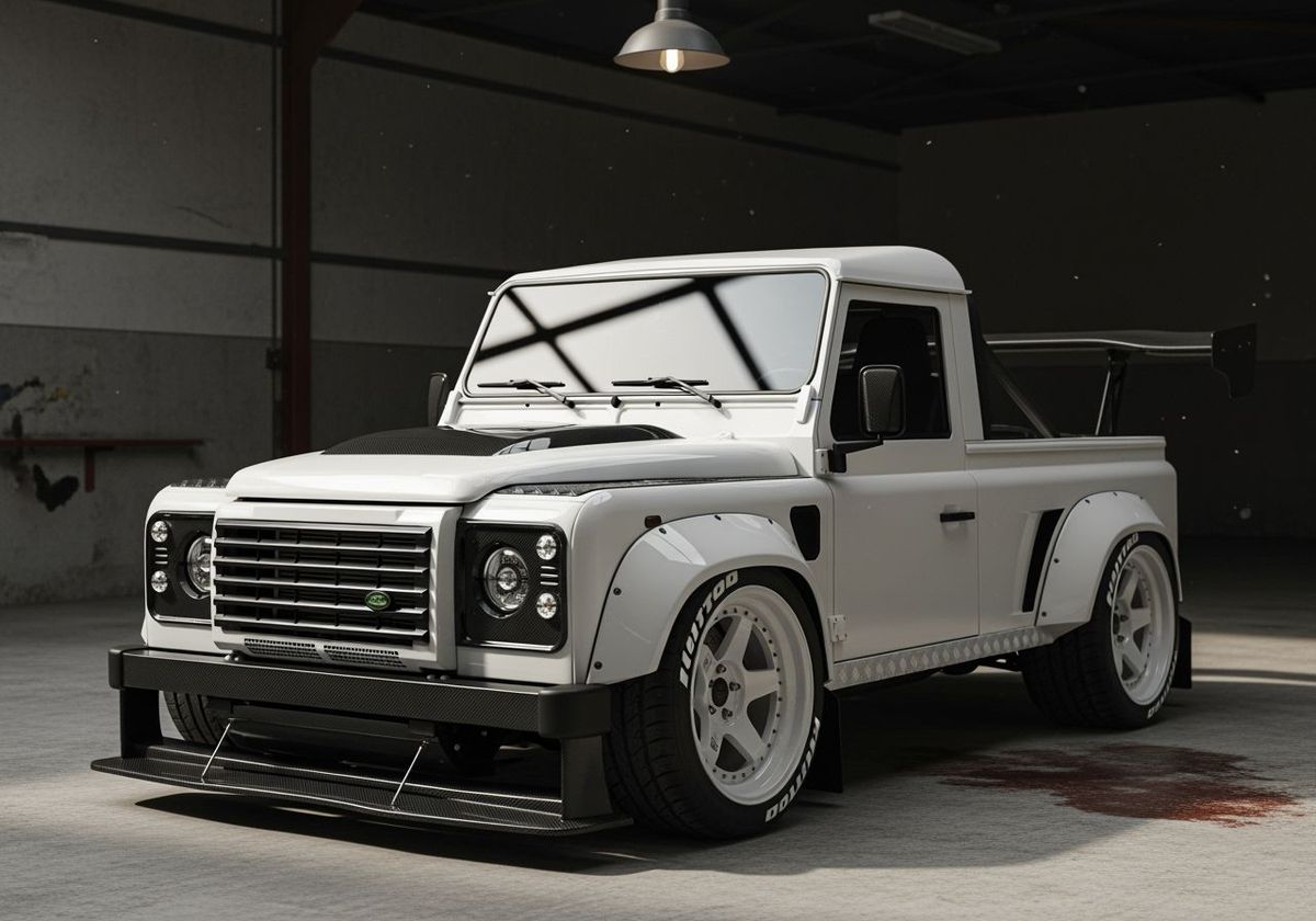 This image shows a heavily modified 2011 Land Rover Defender with a widebody kit in a gritty garage setting. The vehicle features a lowered suspension, carbon fiber spoiler, and custom wheels, rendered with realistic, dystopian undertones.