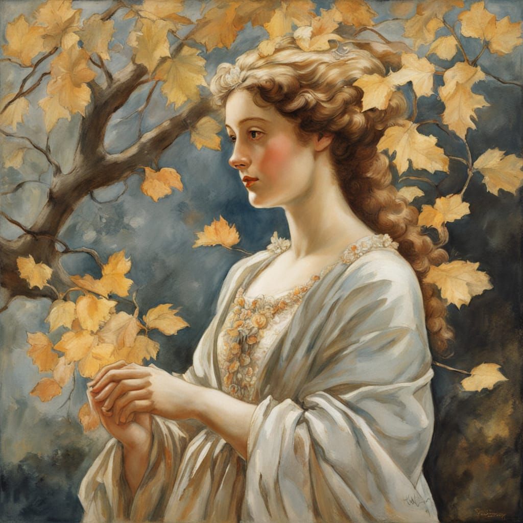 A delicate French romantic portrait of a woman in a gentle gown, set against a warm golden light filtering through the leaves of a nearby tree. Created in a soft, dreamy watercolor style with intricate golden details and a soft, pastel color palette.