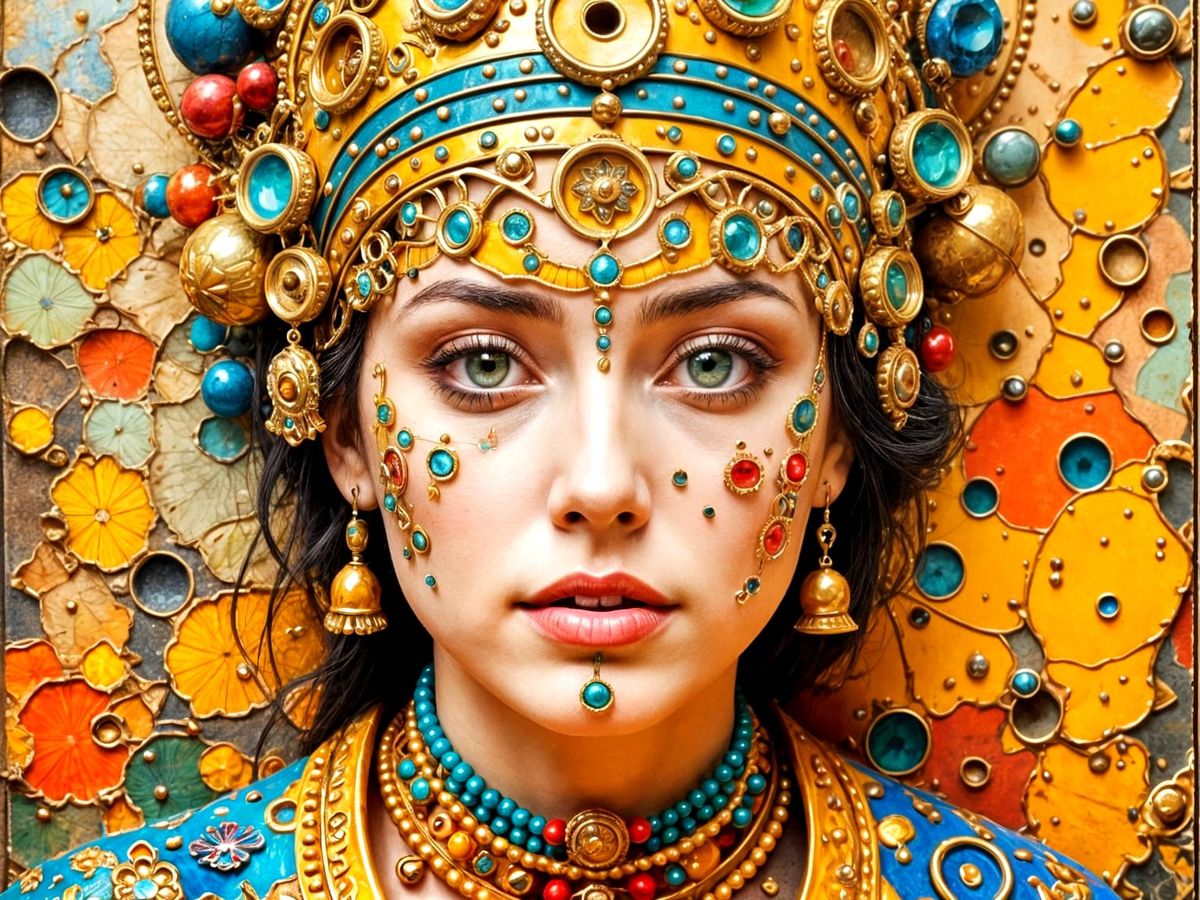 This image features a close-up of a woman adorned with colorful spheres in various sizes. She is wearing an elaborate dress and headdress, in a hyperkraximalistic style.