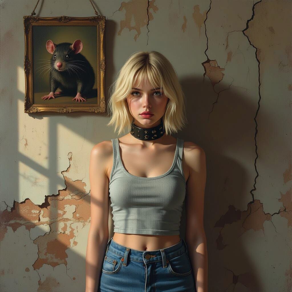 This image depicts a young woman experiencing intense paranoia in a decaying room. Dramatic shadows and a desaturated palette create a sense of unease and psychological distress, rendered with high contrast.