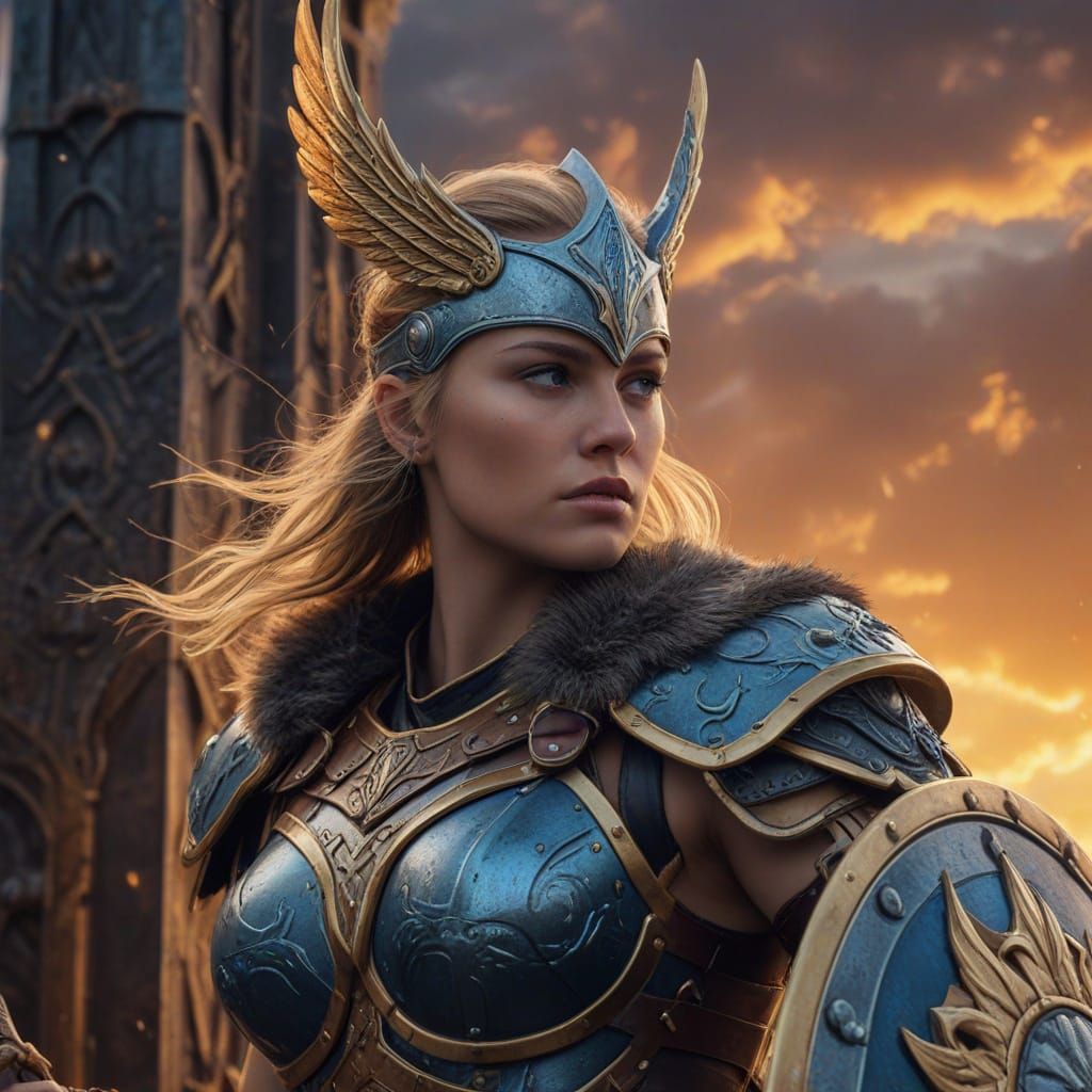 A striking picture of a Norse Valkyrie queen in leather armor guarding the gates of Valhalla. The image is a vibrant oil painting with golden accents, a mystic blue glow, and warm sunset lighting.