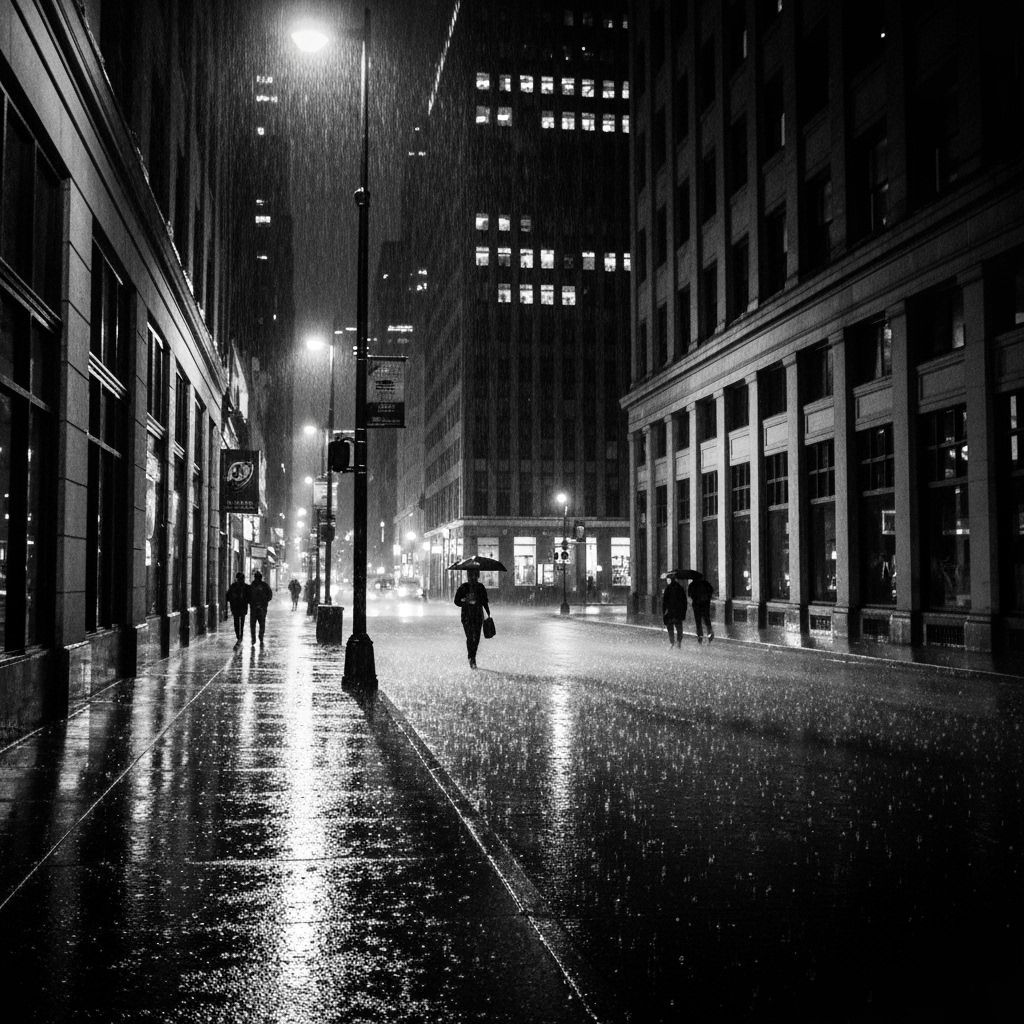 This image shows a monochrome cityscape of rain-slicked streets. Cinematic shadows add depth and drama to the urban scene.