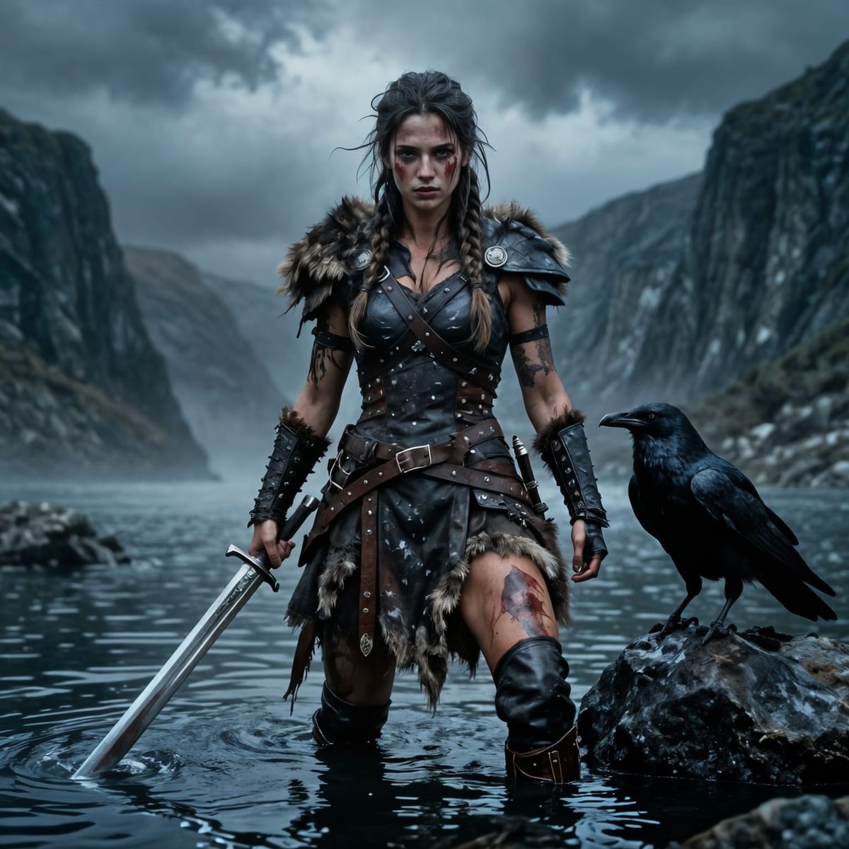 A brutal, ultra-realistic dark fantasy portrait of a scarred female warrior in rugged armor, gripping two swords. Her raven companion watches intently.