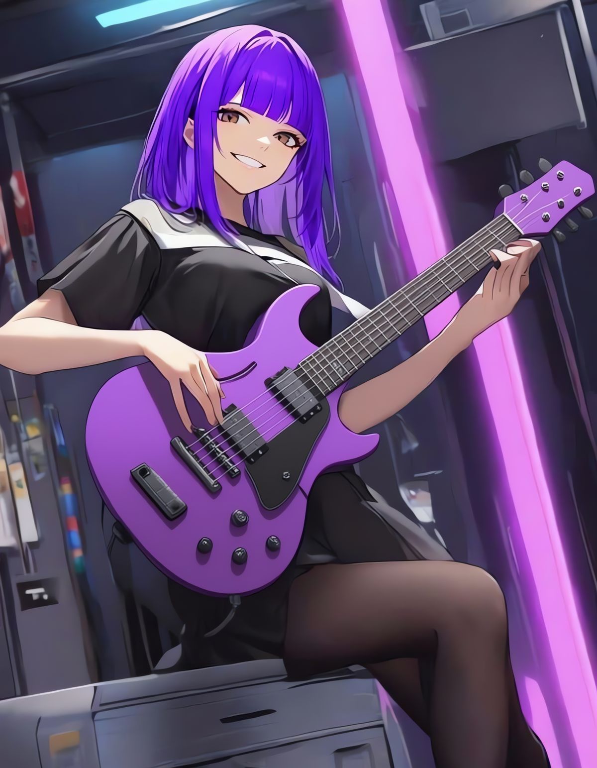 1girl, solo, bishounen, female focus, full chest, fair skin, dark brown eyes, short neon purple hair, straightened hair, straight bangs, black blouse, white tie, short black skirt, long tights, black shoes, smiling, looking at the viewer, holding a purple elctricguitar, indoors, dark plastic studio, ...