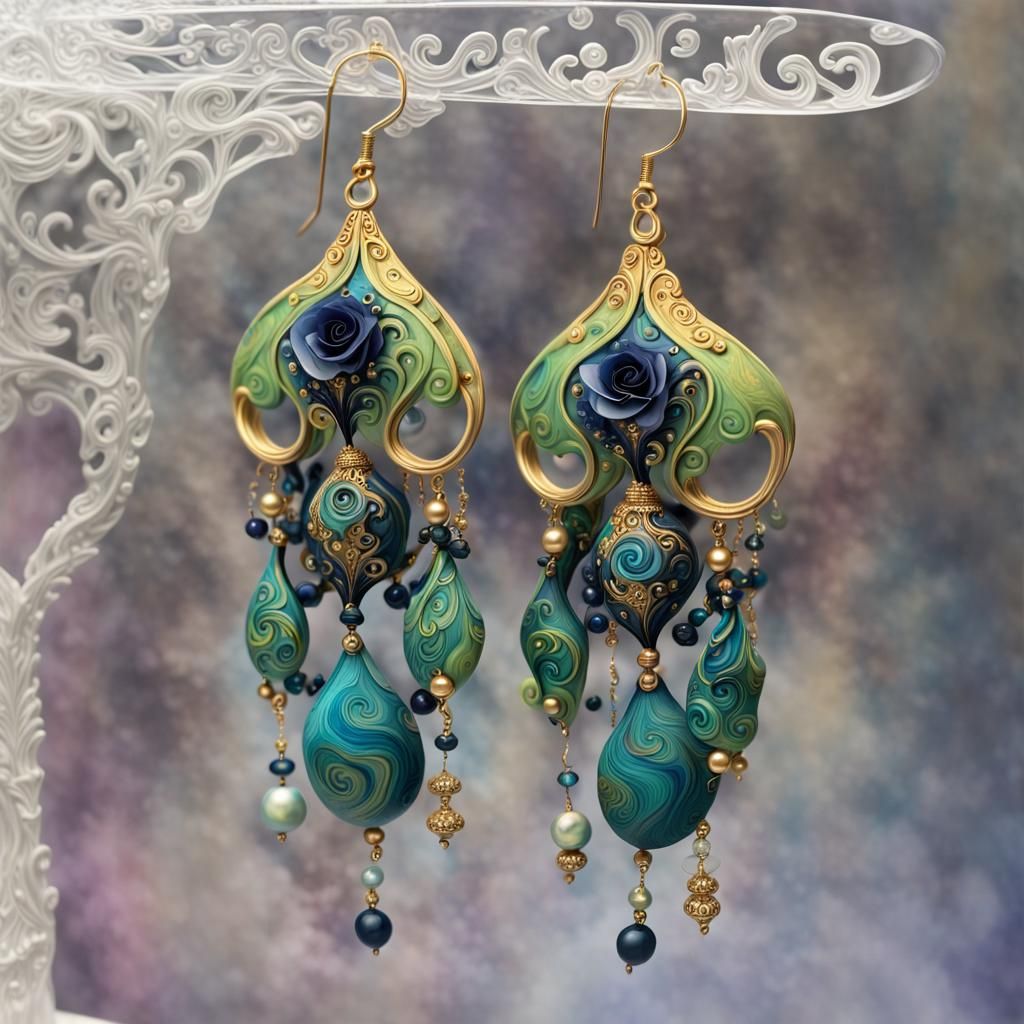 This image shows ornate earrings displayed on a jewelry stand. The earrings feature English-style flourishes, metallic beads, colored pearls, and crystals with oil-painted textures, in a fantasy aesthetic.