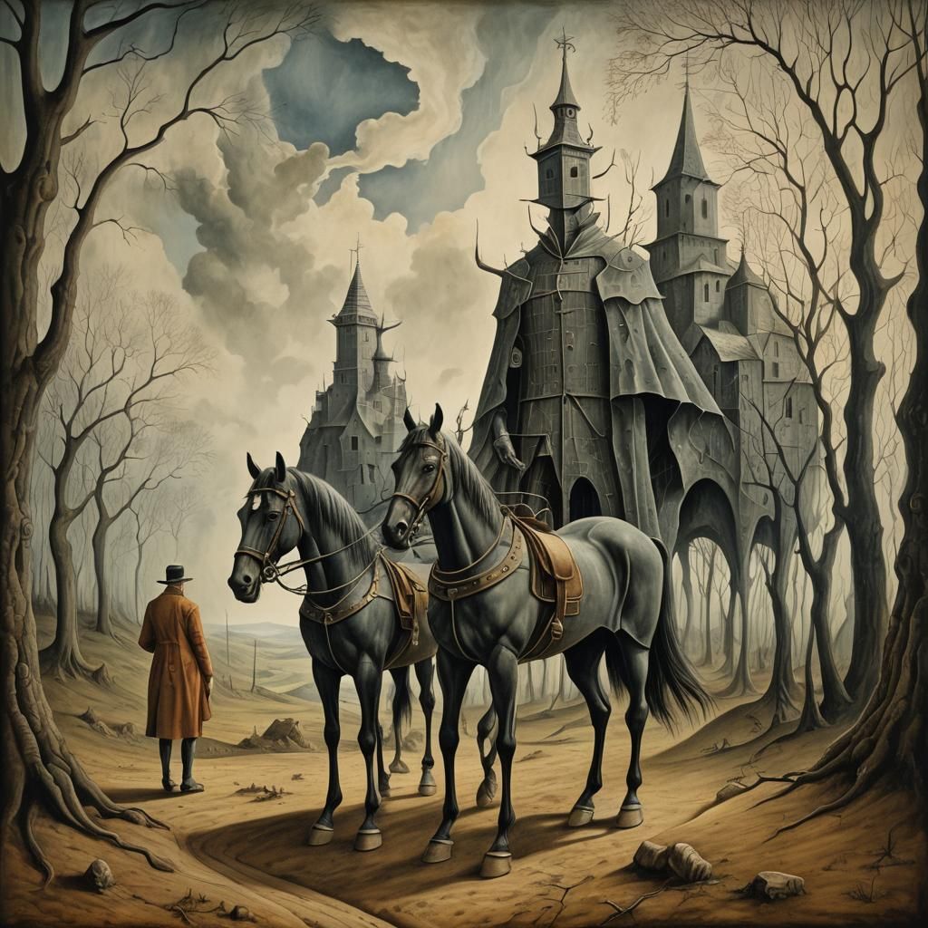 This image shows two mysterious figures on horseback in a desert landscape, captured from a low angle. It's surrealist art with crystallized oil textures and bright colors, reflecting symbolic solitude in a captivating manner.