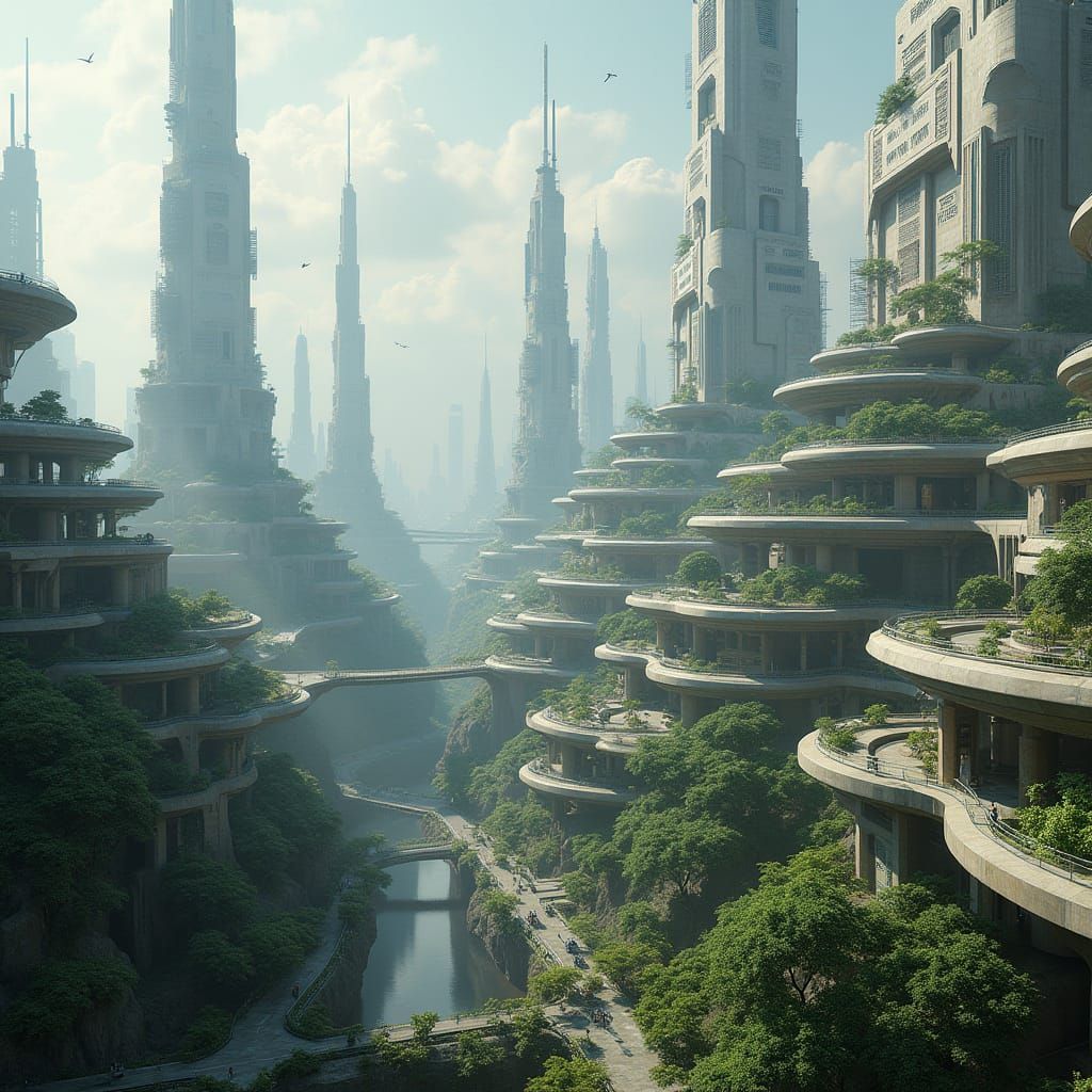 A hyperrealistic image showcasing a futuristic cityscape filled with brutalist and modern skyscrapers. The city features open spaces, hanging gardens, suspended roads, and grand rooftop terraces in a cinematic style.