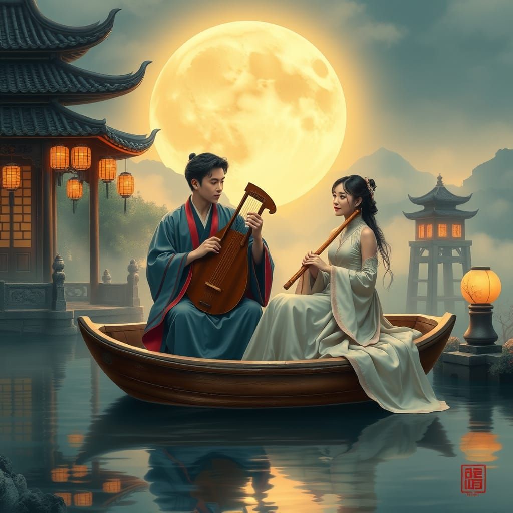 A young man and woman are seated in a small wooden boat on a tranquil lake, bathed in the soft glow of a full moon. He plays a stringed instrument, perhaps a pipa, while she holds the bamboo flute, the boat guiding them gently across the water. Traditional Chinese architecture lines the shores of the lake, their lanterns casting warm, inviting light. The surrounding mountains rise in the distance, creating a serene and romantic backdrop. The scene evokes a sense of peaceful intimacy and connection, heightened by the beauty of the moonlit night.