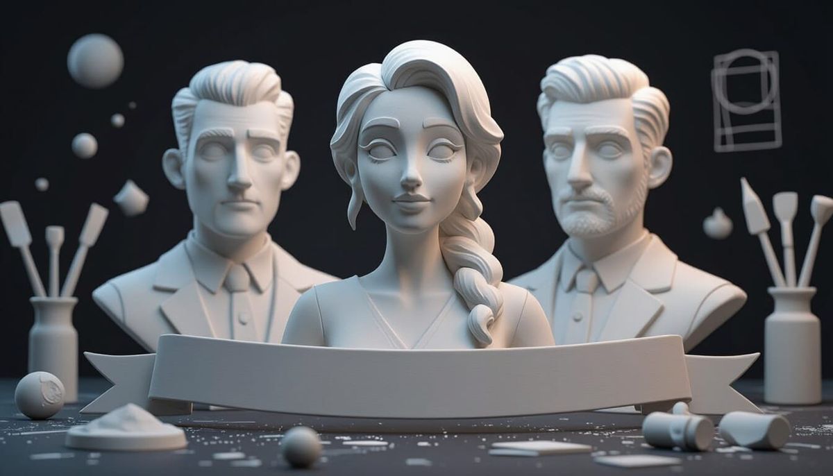This image showcases a professional arrangement of 3D character models, appearing as clay or polished pieces. Soft studio lighting highlights the cinematic 3D style with subtle artistic elements at the edges.