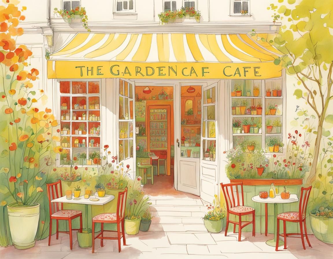 A digital drawing of a cafe scene in a garden setting. The artwork utilizes a whimsical, sketchy style reminiscent of doodles, creating a lighthearted aesthetic.