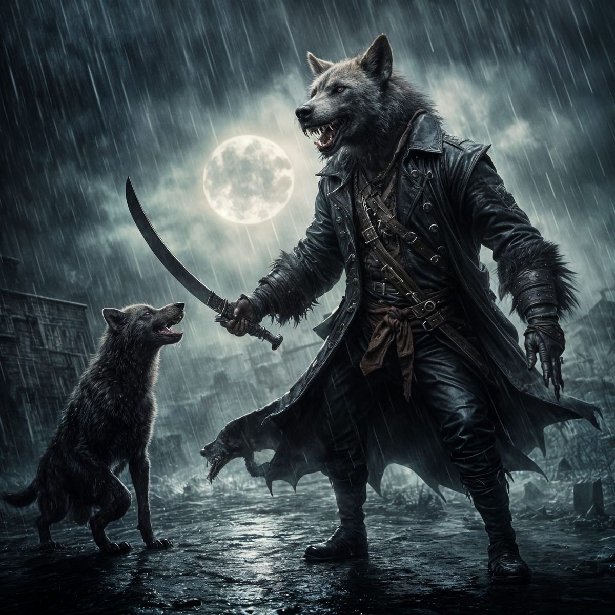 This image shows an intense sword fight between a hyena pirate and a wolf pirate in a heavy rainstorm. The scene is highly detailed with a dark fantasy aesthetic and dynamic composition.