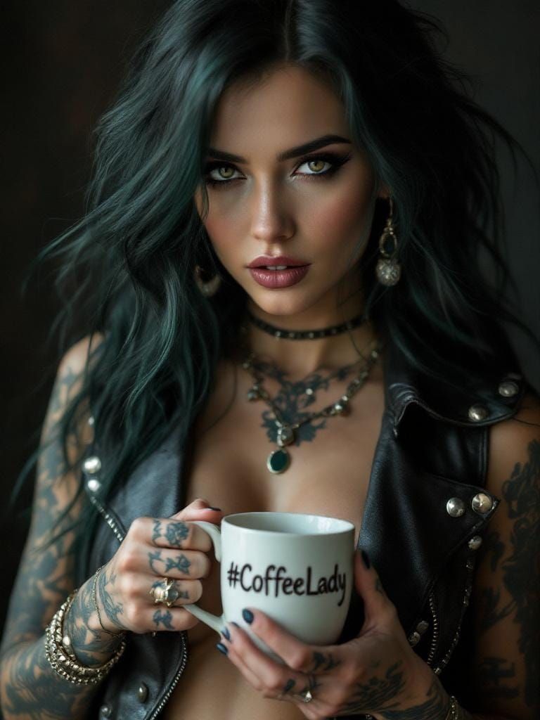 A striking picture of an alternative woman with dark green hair and tattoos. She wears a studded leather vest and holds a mug, conveying a rebellious yet intimate morning mood.