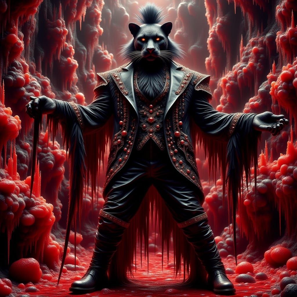 This image shows a majestic panther drag king in a stunning underground ballroom, with crystalline structures reflecting red, black, and silver hues. The performer exudes elegance with a bespoke tuxedo and dramatic accessories, embodying ancient feline mysticism.
